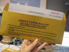 A ballot completed and typically mailed in advance of an election by a voter who is unable to be present at the polls.