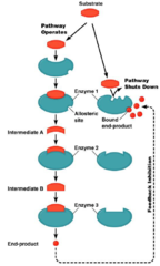 Product is used by next step in pathway, final product in inhibitor of earlier step, not unnecessary accumulation of product
