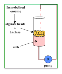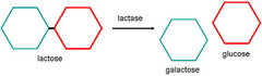 Lactase breaks down lactose into glucose and galactose, by pouring lactose into a container filled with lactase gelatin beads which then breaks it down.